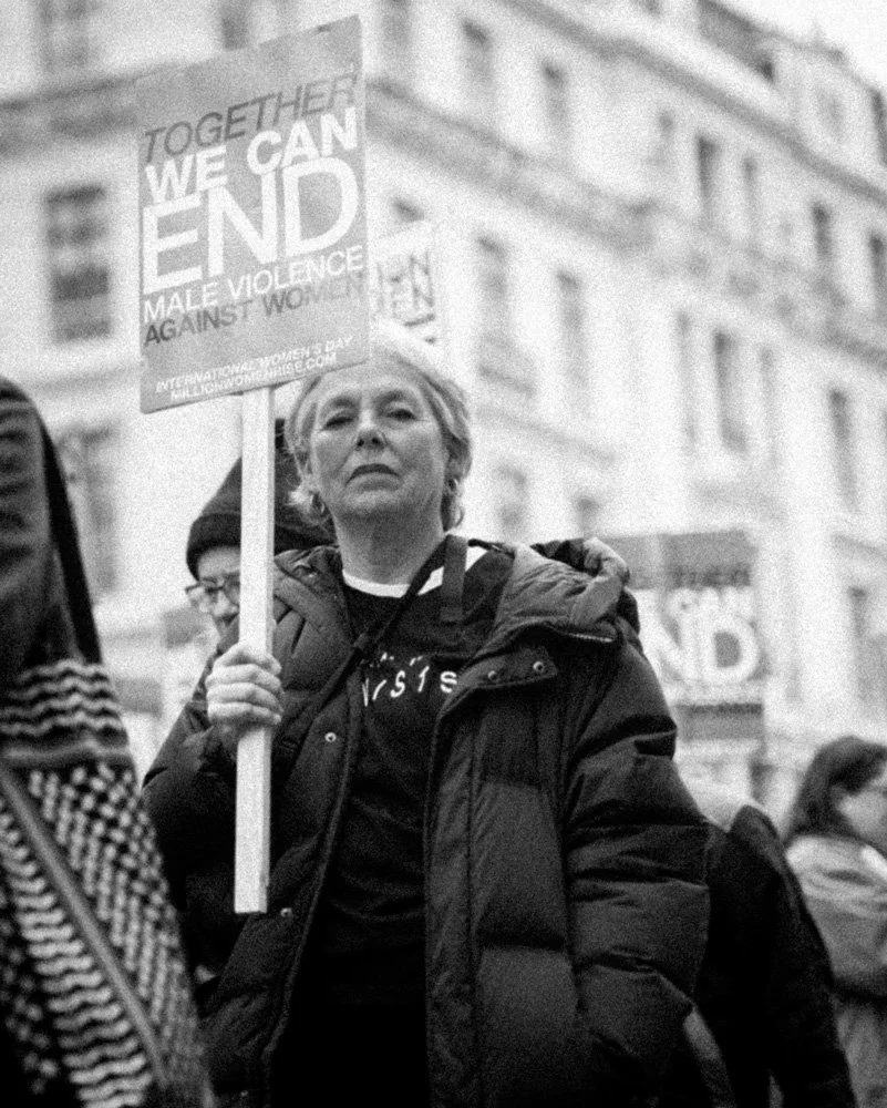 A woman holding a sign reading "Together We Can End Male Violence Against Women", looking directly into the lens. Regent Street, London. March 2026
